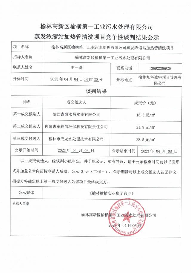 榆林高新區(qū)榆橫第一工業(yè)污水處理有限公司 蒸發(fā)濃縮站加熱管清洗項目競爭性談判結(jié)果公示