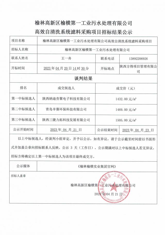 榆林高新區(qū)榆橫第一工業(yè)污水處理有限公司高效自清洗系統(tǒng)濾料采購項目招標結(jié)果公示