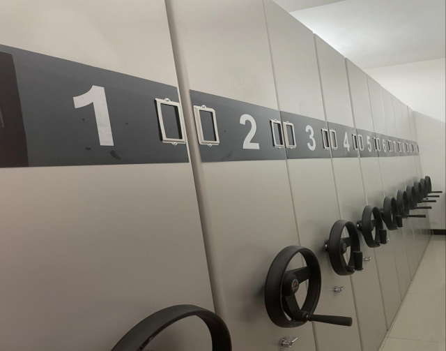 ? 根據(jù)現(xiàn)有檔案室空間大小,設計安裝了4組10列共40組密集架。每組密集架為6層雙面,每個區(qū)移動邊列安裝柜門,每列都能密封關閉,確保了檔案室的保密性、防潮性和美觀性。