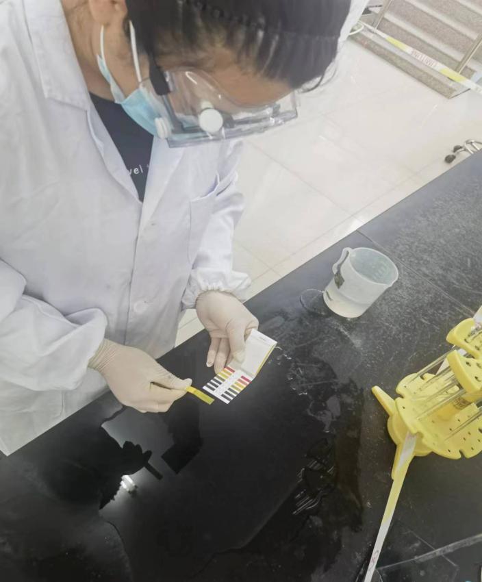 演練主要內(nèi)容為模擬實(shí)驗(yàn)室發(fā)生濃硫酸泄露致使化驗(yàn)員手部灼傷的場(chǎng)景。事故發(fā)生后,科室負(fù)責(zé)人立即啟動(dòng)危險(xiǎn)化學(xué)品安全事故應(yīng)急處理預(yù)案進(jìn)行指揮救助處置。安排一人用濾紙或紗布等物品將傷者手上殘留的硫酸吸去,減去手套,用大量水沖洗,繼續(xù)用5%碳酸氫鈉溶液沖洗。其它人員負(fù)責(zé)現(xiàn)場(chǎng)硫酸的處理工作,拉起警戒線,并用堿石灰將散落的硫酸覆蓋,將石灰收集到一起。然后用水沖洗地面,測(cè)試廢水的PH值,合格后用抹布擦洗地面。事故警戒、應(yīng)急救援、泄露處置、環(huán)境恢復(fù)等工作緊張有序開展,受傷員工得到有效救護(hù),濃硫酸泄漏得到有效控制,未對(duì)環(huán)境和實(shí)驗(yàn)室安全運(yùn)行產(chǎn)生不良影響。