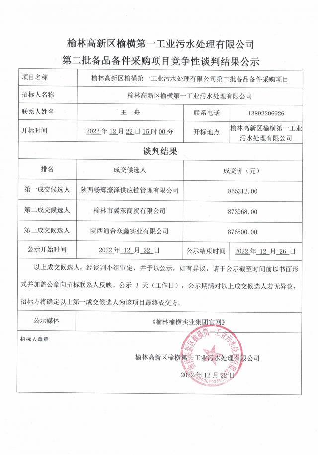 榆林高新區(qū)榆橫第一工業(yè)污水處理有限公司第二批備品備件采購項目競爭性談判結(jié)果公示